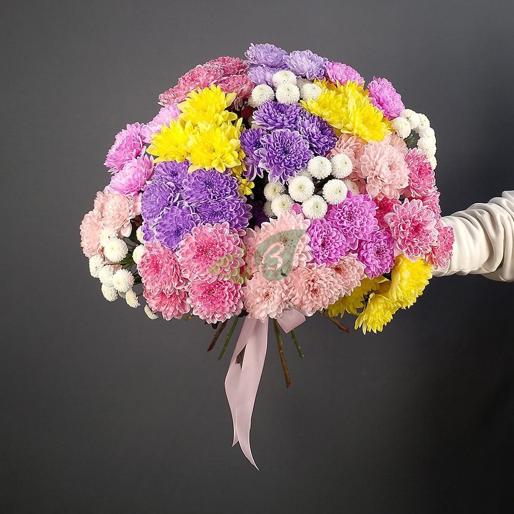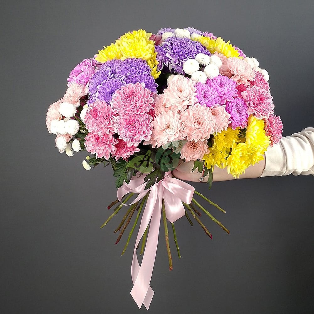 Закажите большой букет из сиреневых, белых, желтых и розовых хризантем.